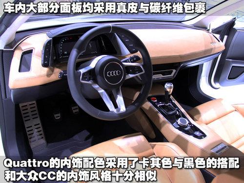 奧迪Quattro概念車的內(nèi)飾風(fēng)格與大眾CC十分相似,都采用了卡其色和黑色的配色。奧迪Quattro概念車的內(nèi)飾面板用料基本上僅有兩種材料,真皮和碳纖維。