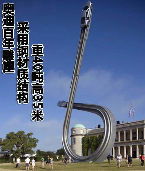 在奧迪百年慶典時,Gerry Judah就為奧迪量身打造了紀念雕塑。奧迪百年慶典雕塑座重達40多噸,高35米,采用鋼結構雕塑,展示了兩輛汽車直沖云霄的場景,祝福奧迪公司能在下一個百年更上一層樓。雕塑上的兩輛汽車分別為1937年經典流線賽車和R8 V10引擎運動跑車。設計師稱,這項雕塑體現了奧迪汽車的運動精神、業界威信和開拓勢頭。它將是今年英格蘭古德伍德速度節上的一大亮點。
