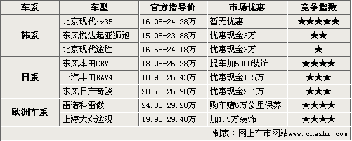 通過上表列出了8款比較熱銷的SUV車型,可以看出,主要競爭對手CRV和ix35 均無優惠,CRV銷售方式依然高調,購車需加裝飾。其他韓日車系,優惠幅度都在1.5萬元以上,其中獅跑和途勝最高優惠高達3萬元,另外大眾品牌的途觀也是供不應求,購車需加1.5萬元裝飾。權衡哪一款SUV最適合自己、最具性價比,才是消費者最為關注的,下面就詳細為大家介紹一下。