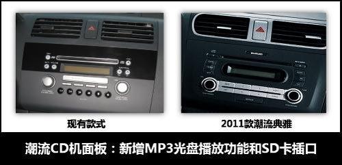 內(nèi)飾方面,銀色成為雨燕2011款內(nèi)飾的主色調(diào)。方向盤采用點狀皮紋,真皮觸感;經(jīng)過重新設(shè)計的CD面板,按鍵布局更加合理,按鈕與銀色按鍵組合協(xié)調(diào)。CD還新增了MP3光盤播放功能和SD卡插口,可以播放多種格式音樂。