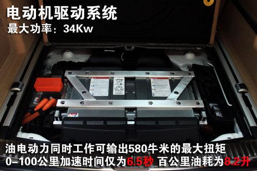 電動機位于車輛尾箱內,在288伏的電壓下,電動機可提供34千瓦的最大輸出功率,同步電機采用內置轉子設計,好處是不僅具有緊湊的尺寸,還可以作為啟動馬達和交流發電機使用。在油電共同工作時,可得到580牛米的最大扭矩,0-100公里的加速時間僅為6.5秒,而這樣的動力以往只能在8缸汽油發動機上得到,其廠商公布的百公里油耗也只有8.2升。