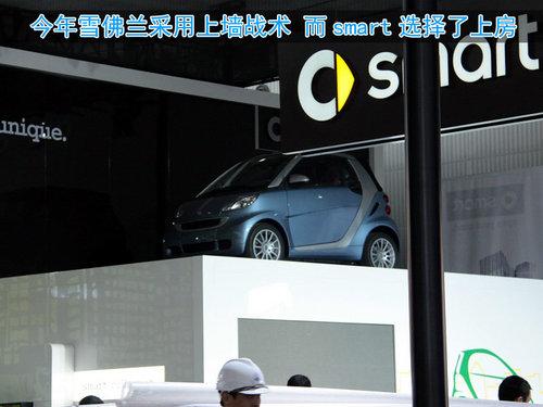 為了吸引觀眾的眼球,各個廠商也費(fèi)勁了心思布展,雪佛蘭看上了歷年MINI的絕招,就是把車掛在墻上,而Smart則直接將車擺上了房頂。這使我不得不去聯(lián)想下屆車展會不會倒掛在房頂上?車展吸引人的地方有很多,其中就包括我們在這里可以親眼看到一些神車,例如我們眼前的尚酷R,這個版本在中國來說目前沒有銷售。