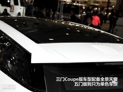 車頂采用懸浮式錐形設計,此處對整車展現的姿態(tài)起到了決定性的作用,令其風格與一些運動型跨界車型異曲同工,三門Coupe版車型配備全景天窗,五門版則只為單色車頂。