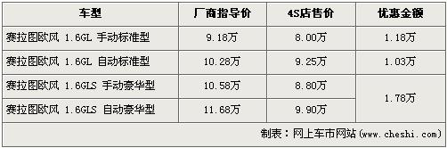 據(jù)經(jīng)銷商處銷售人員介紹,賽拉圖歐風全系最高出現(xiàn)1.78萬元的優(yōu)惠。賽拉圖歐風在售的有4個車型,入門級的1.6L手動標準版的優(yōu)惠金額為1.18萬元,售價從廠商指導價9.18萬元降到8萬元,1.6L豪華版的手動版和自動版車型都經(jīng)全系最高1.78萬元優(yōu)惠后,售價分別降至8.8萬元和9.9萬元。銷售人員還介紹,目前賽拉圖歐風車型比較緊張,現(xiàn)車數(shù)量一般。