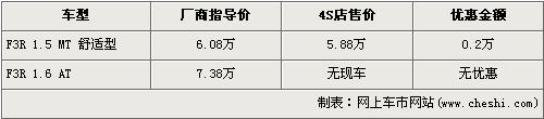 據比亞迪汽車北京地區4S店銷售人員介紹,目前北京在售的比亞迪F3R有兩款車型。1.5L手動舒適版經2000元的優惠后售價從6.08萬降到了5.88萬元,1.6L自動檔車型目前店內沒有現車,所以不再此次優惠隊列中。
