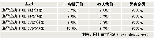 經銷商表示,海馬歡動1.8L排量車型,最低配的手動舒適型售價8.76萬,最高配的自動(CVT)豪華型售價10.66萬,優惠金額均為9千元,除現金優惠外還會有相應的裝飾贈送。現金優惠配合購置稅優惠,則大大減輕了消費者的購車負擔。