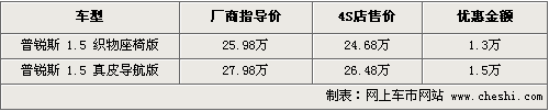 豐田普銳斯是豐田公司開發的一款混合動力車,是較為成熟的環保車型,自進入國內市場后一直受到消費者的歡迎。普銳斯獨特的環保科技為后來的混合動力車型提供了借鑒。目前筆者了解到,普銳斯的售價出現了一定幅度的松動,最高可優惠現金1.5萬元,具體車型以及價格如下列表: