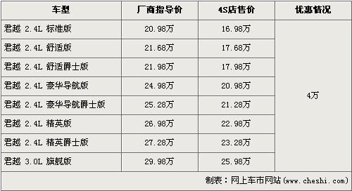 今年的7月8日,別克終于推出了帶著家族新元素特征的中級車市場的又一力作-新君越。新君越的加入無疑給別克軍團(tuán)再次打了一針“興奮劑”,其與新君威形成了很好的市場互補(bǔ)。別克經(jīng)銷店已經(jīng)可以接受新君越的預(yù)訂工作,訂金為10萬元,并且為了清理老款君越的庫存車,老君越出現(xiàn)了全系降4萬元的優(yōu)惠,具體價格請看下表: