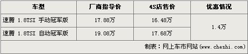 速騰冠軍版可以說是一汽大眾繼老款寶來后,又一款可以稱得上是“駕駛員之車”的車型。出自大眾先進的PQ35平臺,再加上配備缸內直噴的1.8TSI發動機,更寬的輪胎這一切的“與眾不同”使得速騰冠軍版收到了許多膜拜性能的消費者的喜愛。據了解,速騰1.8TSI出現了1.4萬元的優惠,具體價格詳情請看下表: