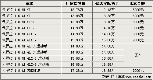 據(jù)一汽豐田4S店銷售人員介紹:目前2.0L排量的運(yùn)動(dòng)版車型無現(xiàn)車銷售,購買其他車型則可以享受到8000元——9000元的現(xiàn)金優(yōu)惠。入門級(jí)的1.6 MT GL版車型售價(jià)降到了12.18萬元,高配的1.8 AT PREMIUM版經(jīng)9000元優(yōu)惠后,售價(jià)也降到了16.38萬元。