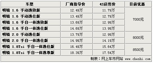 據4S店銷售人員介紹:目前明銳全系最高優惠8500元。1.6升車型優惠已達7000元,較之前優惠幅度增加了1000元。2.0升車型優惠仍為8000元,1.8TSI的兩款車型優惠8500元,較之前有所縮水。雖然1.6升車型優惠幅度較之前有所增加,但目前全系依然沒有現車,訂車最短需等一個半月,最長需等3個月。不過,某些店內有很少量現車,是訂車客戶已退車輛。但優惠幅度較小,所以建議不著急用車的朋友預定車輛可獲得以上優惠。如在店內做裝飾還可打8折,雖然折后裝飾價格仍有些偏高,但產品質量可以保證。