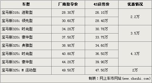 新寶馬3系在去年12月份正式在國內市場正式上市銷售,經過改款后的3系從外觀的流線,到內飾的風格均有一定程度的變化,帶給消費者的是全新的視覺沖擊和駕馭樂趣。根據網上車市價格監測系統顯示,新寶馬3系車型全系出現了不同的現金優惠,最高優惠達到了4.3萬元,具體車型價格如下: