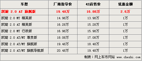 東風雪鐵龍凱旋在同級別車型中性價比較高,前沿的中控臺設計,中央集控式方向盤、EPS+GPS導航等豐富的配置均在凱旋上能夠看到。根據網上車市價格檢測系統顯示,目前個別商家針對凱旋推出了特價車型,優惠幅度達2.6萬元,并可以獲得部分禮品,具體車型和價格如下: