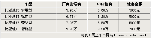 比亞迪F3系列車(chē)市一直都是自主家用車(chē)市場(chǎng)中的寵兒,在推出了白金版以及全新的智能性車(chē)型之后,更是吸引了消費(fèi)者的關(guān)注。網(wǎng)上車(chē)市網(wǎng)站近期又比亞迪4S店處了解到,現(xiàn)在各家店內(nèi)的車(chē)型均較為齊全,根據(jù)不同的車(chē)型最高可給出7000元的優(yōu)惠。詳情如下: