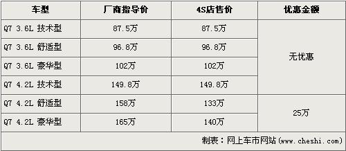 Q7是奧迪打造的第一款“高性能SUV”,同時也是奧迪引進中國的第一款頂級SUV車型。Q7憑借杰出的運動性、高超的操控性及沖擊性極強的外形在上市時就獲得了人們的關注。隨著在上海車展亮相的改款新Q7即將上市,在售的老款Q7已經停產。近日根據網上車市價格檢測系統顯示:在售的奧迪Q7出現了最高為25萬元的優惠,具體詳情請看下表: