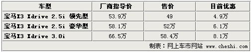 繼X5成功的引進(jìn)我國(guó)后,寶馬又將其X系列旗下的緊湊型SUV寶馬X3帶到了中國(guó)。目前國(guó)內(nèi)在售的X3 2.5Si與X3 3.0si是在X3基礎(chǔ)上衍生而成的運(yùn)動(dòng)版車(chē)型,將寶馬特有的靈敏性與運(yùn)動(dòng)型多用途車(chē)的廣泛實(shí)用性完美結(jié)合。近日據(jù)網(wǎng)上車(chē)市價(jià)格數(shù)據(jù)監(jiān)測(cè)顯示,寶馬X3全系最高有近8.1萬(wàn)元的現(xiàn)金優(yōu)惠,具體詳情請(qǐng)看下表: