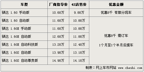 據東風日產4s店銷售人員介紹,目前騏達全系車型也有現金8千元的優惠。而同樣現在騏達、頤達兩款車型為訂單生產,北京地區4S店目前只有個別1.6J銀色時尚版車型,其他款車型均無現車,購買者需交1000元訂金約等1個月至1個半月的時間。