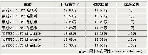 據(jù)銷售人員表示,目前購買1.8T榮威550車型全系可以優(yōu)惠1.3萬元,并加贈超值的保養(yǎng)及裝飾,同時,各店1.8L的榮威550車型也相當(dāng)充裕,顏色齊全,購車用戶可享受最高1萬元的優(yōu)惠。其他4S店也基本維持在這個優(yōu)惠基礎(chǔ)之上進行銷售,不論是1.8T還是1.8L車型均可滿足消費者的購車挑選需要。
