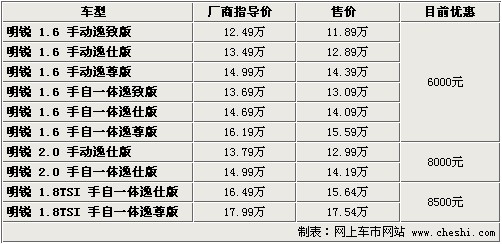 據(jù)4S店銷(xiāo)售人員介紹:目前明銳全系最高優(yōu)惠8500元,部分車(chē)型有現(xiàn)車(chē),顏色包括銀色、灰色車(chē)型。如需預(yù)定需等待1個(gè)月至3個(gè)月時(shí)間。目前1.6升車(chē)型優(yōu)惠達(dá)6000元,2.0升車(chē)型優(yōu)惠仍為8000元,1.8TSI的兩款車(chē)型優(yōu)惠8500元,較之前有所縮水。如在店內(nèi)做裝飾還可打8折,雖然折后裝飾價(jià)格仍有些偏高,但產(chǎn)品質(zhì)量可以保證。