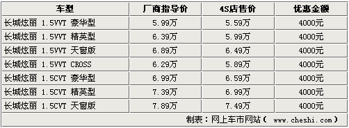 本次長(zhǎng)城炫麗首先由廠家開始優(yōu)惠,全系車型中1.3L兩款車型官降4000元,其他車型均降3000元。而經(jīng)銷商處則可在廠家官降的基礎(chǔ)上再給出千元的優(yōu)惠。