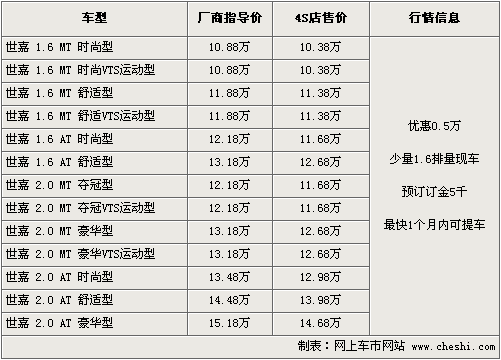 據東風雪鐵龍4S店銷售人員介紹,世嘉目前在售車型共有13款,全系優惠5千元,現車只有部分1.6排量車型,2.0車型需要預訂,訂金5千元,最快1個月內就可以提車。另據了解,所有手動款車型都有普通版及VTS運動版可供選擇,其價格是完全相同的,可根據消費者自身要求購買。如消費者有意購買,到店詳談會有更優惠的價格。北京地區各4S店由于訂單不同,各店銷售的現車顏色有所不同。