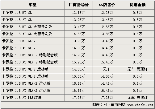 卡羅拉進入國內時間比較長,積累了一定的消費人群,不僅國內,臺灣的消費者對卡羅拉也是情有獨鐘。目前花冠EX和第十代卡羅拉共同銷售,在天窗特別版卡羅拉推出后,性價比方面有進一步提升。目前4S店內有現(xiàn)車供應,最高可優(yōu)惠現(xiàn)金8000元。