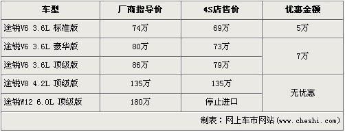 途銳是大眾首款引進我國的SUV車型,在3.6L及4.2L率先上市后,大眾為了滿足消費者的更大胃口,緊接著又推出了搭載12缸發動機的6.0L車型。隨著大排量消費稅的頒布,給9月份后入關的大排量車型帶來了一次不小的沖擊,令大排量汽車價格都上調了不少。近日據網上車市價格系統監測顯示,大眾途銳的6.0L車型已經停止進口,并且購買目前購車可以得到最高7萬元的優惠,具體詳情請看下表: