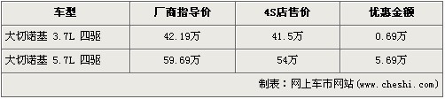 吉普大切諾基是吉普家族中極具個性的一款大尺寸車型,在推出3.7L排量車型后,消費(fèi)者的選擇空間更大,同時帶給駕乘者完全不同的駕駛體驗。根據(jù)網(wǎng)上車市價格監(jiān)測系統(tǒng)顯示,目前大切諾基最高優(yōu)惠5.69萬元,具體車型以及價格如下: