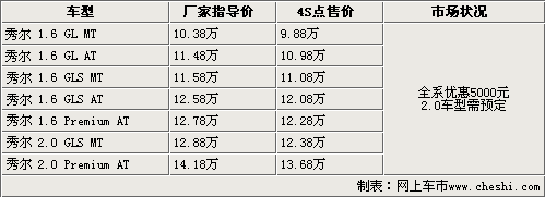 據東風悅達起亞4S店銷售人員介紹:現在購買起亞秀爾全系均可以得到5000元的現金優惠。目前秀爾現車充足,顏色也比較齊全,現車顏色以白色、銀色、橙色、紅色為主。2.0車型需要預訂,需要繳納訂金5000元,一周左右可以提到現車。北京地區各4S店由于訂單不同,各店銷售的現車顏色有所不同,消費者在購買前可以多去幾家4S店。