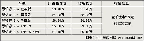 東風(fēng)本田旗下的首款運(yùn)動(dòng)中高級(jí)車(chē)型——思鉑睿于09年9月初上市,全系共計(jì)五款車(chē)型,售價(jià)為23.78萬(wàn)元—27.18萬(wàn)元。上根據(jù)網(wǎng)上車(chē)市價(jià)格監(jiān)測(cè)系統(tǒng)顯示,目前購(gòu)買(mǎi)思鉑睿全系可優(yōu)惠現(xiàn)金2萬(wàn)元,現(xiàn)車(chē)方面較為齊全。具體車(chē)型行情如下: