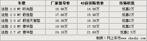 北京現代途勝是韓系車中非常經典的一款城市型SUV,寬大的空間,時尚的外觀以及人性化的配置使眾多消費者都鐘情它,從上市到現在在SUV市場中一直有著不錯的銷量。近日根據網上車市價格監測系統顯示,目前購買現代途勝車型最高可以得到2.5萬的現金優惠。具體車型見下表: