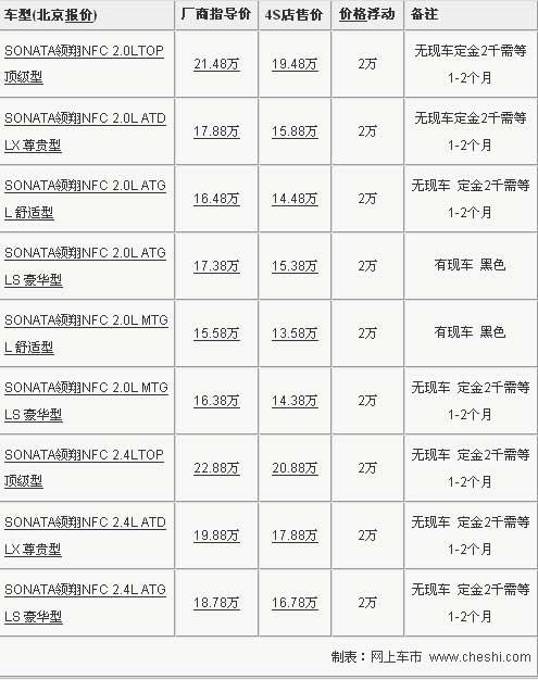 作為SONATA御翔的換代車型-----北京現代索納塔領翔于08年底正式上市銷售,是結合了韓國現代最先進的造車技術,憑借著大氣穩重外形,寬大空間,乘坐性高,強勁動力等較高的綜合性價比屹立于中級車之林。根據網上車市價格監測系統顯示,目前領翔全系現金優惠2萬元,現車不全,具體車型需預定,具體行情如下: