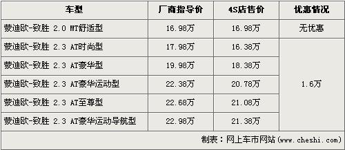 福特蒙迪歐-致勝出自福特最新開發的EUCD技術平臺,它采用了沃爾沃S80底盤技術。在歐洲,蒙迪歐致勝與皇冠成為競爭對手,是一款定位高于雅閣、凱美瑞之流的轎車。近日據網上車市價格系統檢測顯示,蒙迪歐-致勝現車優惠1.6萬元,具體車型價格詳情請看下表: