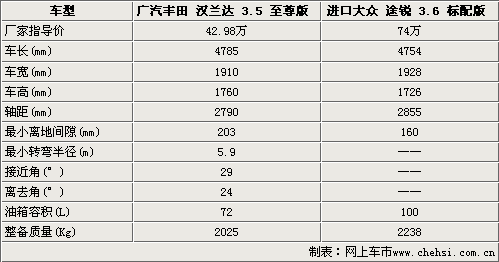 廣汽豐田漢蘭達和進口大眾途銳均屬于一個級別的城市SUV車型,我們選取的兩款車型均是3.5排量這個級別的車型,但是在售價方面卻相差了31萬元。在車身尺寸方面,國產漢蘭達在車長、車高、均超過了進口大眾途銳,這一點保證了其內部頭部空間的寬敞。在軸距方面,進口大眾途銳要比廣汽豐田漢蘭達長出了65mm,這一點意味著途銳的腿部空間將會優越于漢蘭達。在越野性能方面,從上表數據可以看出漢蘭達的離地間隙分別達到了203mm,接近角和離去角分別達到了29°和24°,這樣的參數應該可以滿足一般的越野路況。越野方面進口大眾途銳沒有提供越野參數數據。進口大眾途銳的油箱達到了100升,使您完全沒必要去考慮長途旅行沒油的問題。
