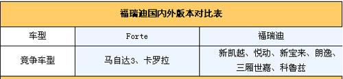 由于二者的定位不同,國內外的競爭車型也有很大差別,在國外Forte最直接的競爭被鎖定為馬自達3和豐田的卡羅拉,但再國內,這一情況將有所改變。目前來看,福瑞迪將來最有力的競爭者將是新凱越、悅動、新寶來、朗逸、三廂世嘉、科魯茲等車型。和卡羅拉、馬自達3的的競爭關系并不是很明顯。
