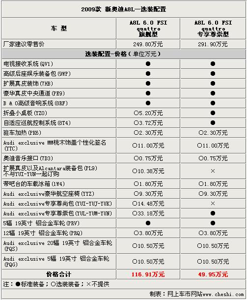 以上的選裝配置需要在預訂車輛前選擇好,經銷商會根據客戶的訂單向廠家發送配置代碼。09款奧迪A8L的選裝配置十分豐富,完全可以滿足對配置有需求消費者的“苛刻”要求。當然,這些配置也需要不菲的金錢才可以擁有,究竟哪些配置適合有品位懂得享受的您呢?