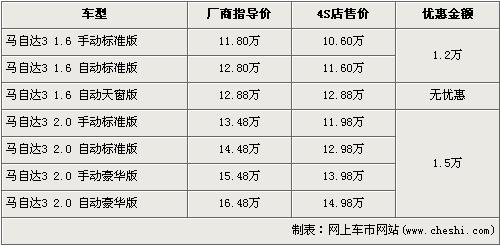 長(zhǎng)安馬自達(dá)旗下主力車型馬自達(dá)3以1.6L車型于06年開場(chǎng),隨后又為車系注入了2.0L車型,2年時(shí)間馬3憑借動(dòng)感的外觀以及優(yōu)越的性能博得了消費(fèi)者的喜愛。今年的4月2日長(zhǎng)安馬自達(dá)又為消費(fèi)者帶來(lái)了1.6L的自動(dòng)天窗版車型,豐富了馬3的銷售車型。據(jù)了解,近期購(gòu)買馬自達(dá)3的消費(fèi)者可以得到最高1.5萬(wàn)元的優(yōu)惠,具體詳情請(qǐng)看下表: