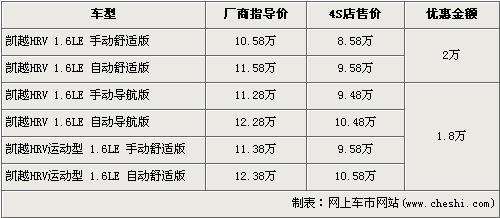 據經銷商處銷售人員介紹,凱越HRV共有6個車型在售,近期除了舒適版現金優惠仍然是2萬元外,其他4款車型的均優惠1.8萬元。入門車型的凱越HRV 1.6LE 手動舒適版現金優惠售價仍為8.58萬元。而導航版與運動版車型優惠1.8萬元,但是此兩版車型店內均無現車,欲購買的消費者需交訂金1萬元,最早兩周內可以提車。