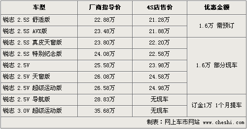 據一汽豐田4S店銷售人員介紹,目前銳志可優(yōu)惠1.6萬元,現車比較齊全,一般購買車型主要集中在舒適版和紀念版,消費者可根據需要選購。另據介紹,新銳志車型要在明年4月北京車展亮相,之后2個月左右才可以購買到,并且新款車型剛上市不會有現款這么大的優(yōu)惠空間,目前購買現款銳志也是一個不錯的選擇。如消費者有意購買,到店詳談會有更優(yōu)惠的價格。北京地區(qū)各4S店由于訂單不同,各店銷售的現車顏色有所不同。