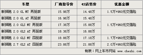 據4S店銷售人員介紹,目前購買獅跑可以贈送960元的交強險,同時有1.5萬-2萬元不等的現金優惠。兩驅標準版優惠后售價僅為14.48萬元。目前經銷商處有黑色、銀色等現車供應,藍色等款需要預定,訂金為2千元,月內便可以順利提車。
