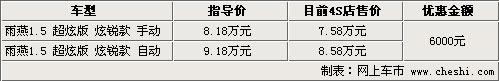 長(zhǎng)安鈴木雨燕以其圓潤(rùn)優(yōu)雅的外形,逐漸受到了消費(fèi)者的青睞,新雨燕自從上市以來(lái),其銷售情況一直比較穩(wěn)定。由于排放問(wèn)題的影響,因此1.3L雨燕在北京市場(chǎng)上已經(jīng)不再銷售。目前在北京市場(chǎng)上,購(gòu)買長(zhǎng)安鈴木雨燕1.5L超炫版炫銳款可以得到6000元的優(yōu)惠。具體車型詳見(jiàn)下表: