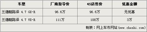 蘭德酷路澤是豐田旗下最經(jīng)典的越野車(chē)型之一,其應(yīng)用了豐田多項(xiàng)高科技技術(shù),不僅增強(qiáng)了全車(chē)的越野性能和安全性,也為駕乘者提供了最直觀的駕乘體驗(yàn)。自去年9月份大排量消費(fèi)稅推出后,豐田越野車(chē)的代表作蘭德酷路澤的廠商指導(dǎo)價(jià)也相應(yīng)作出了調(diào)整,4.7L的兩款車(chē)型售價(jià)分別漲到了96.6萬(wàn)元和111萬(wàn)元。近日據(jù)網(wǎng)上車(chē)市價(jià)格數(shù)據(jù)監(jiān)測(cè)顯示,蘭德酷路澤全系出現(xiàn)了3萬(wàn)元的優(yōu)惠,具體詳情看下表: