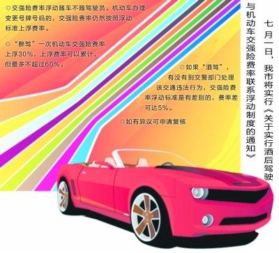 根據昨日省公安廳印發《關于實行酒后駕駛與機動車交強險費率聯系浮動制度的通知》表明,交強險費率與酒后駕駛交通違法行為相聯系的浮動標準已經明確,交強險費率浮動隨車不隨駕駛員。記者從市交警支隊獲悉,7月1日起,我市將開始實施。