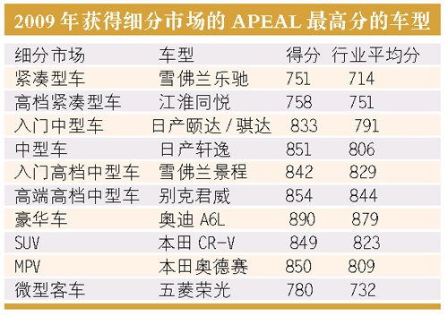 從J.D. Power的研究數據中可以看到,車主對新車性能和設計的總體滿意度進步不明顯:2009年,APEAL平均得分為799分(總分為1000 分),而2007年和2008年的分數分別為797分和800分,三年來幾乎沒有變化。