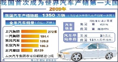 中國汽車技術(shù)研究中心首席專家黃永和10日對記者說,2009年中國汽車產(chǎn)銷超過1350萬輛,首次成為世界汽車產(chǎn)銷第一大國。他預(yù)計2010年中國汽車產(chǎn)銷會超過1500萬輛,跨國汽車公司將從中繼續(xù)受益。據(jù)新華社電
