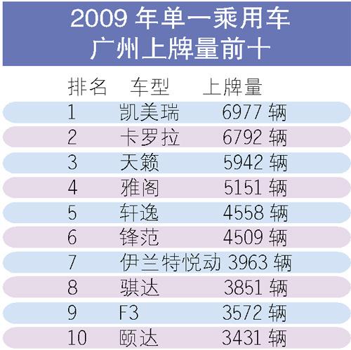 記者從車管所等權(quán)威部門獲得的最新數(shù)據(jù)顯示,2009年廣東省乘用車新車上牌量累計(jì)達(dá)683799輛,與2008年相比增幅達(dá)31.04%。其中,廣州乘用車新車上牌量總數(shù)為152235輛,與2008年同比增幅為33.88%,并以1300多輛的微弱優(yōu)勢(shì)超越深圳,坐上了全省冠軍寶座。凱美瑞成為 2009年廣州本地最熱銷的車型之一,上牌量達(dá)到6977輛,位居單一車型上牌量首位。
