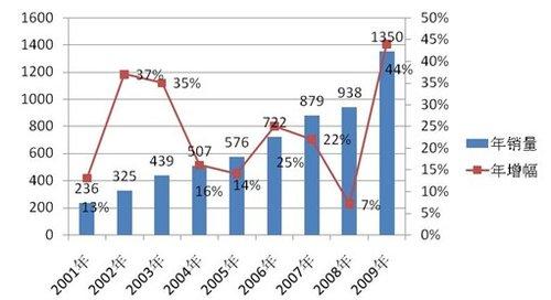 2001-2009年中國(guó)汽車銷量增長(zhǎng)表 單位:萬輛(數(shù)據(jù)來源:中國(guó)汽車工業(yè)協(xié)會(huì))