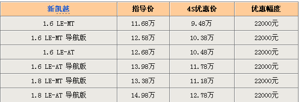 筆者日前走訪北京上海通用4S店時(shí)獲悉,目前新凱越優(yōu)惠再升2000元,達(dá)到了最高2.2萬(wàn)元的讓利,這也是去年以來(lái)最高的優(yōu)惠記錄。由于現(xiàn)在新凱越庫(kù)存車較多,顏色齊全,對(duì)這款車感興趣的消費(fèi)者近期可以出手了。