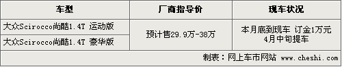 與六代高爾夫同平臺的大眾Scirocco尚酷轎跑車,自從在廣州車展上正式發布以后,引起眾多車友的極大關注,這款車采用了大眾IROC概念車的大量設計元素,是一款既彰顯時尚前衛的運動氣質又能滿足駕駛者日常功能需求的全能轎跑車。根據網上車市價格監測系統顯示,目前尚酷展車已經到店,本月底現車也將陸續到店,4S店開始接受消費者預訂,具體行情如下: