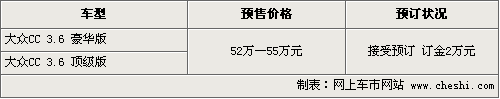 大眾CC自去年廣州車展亮相后一直受到消費者廣泛關注,此前有關這款車的詳細參數和配置已經曝光。大眾CC將搭載3.6FSI燃油直噴引擎和6速DSG雙離合變速箱,將分豪華版和頂級版兩款。根據網上車市價格監測系統顯示,目前這款車有望在下月到店,4S店開始接受消費者預訂,具體行情如下: